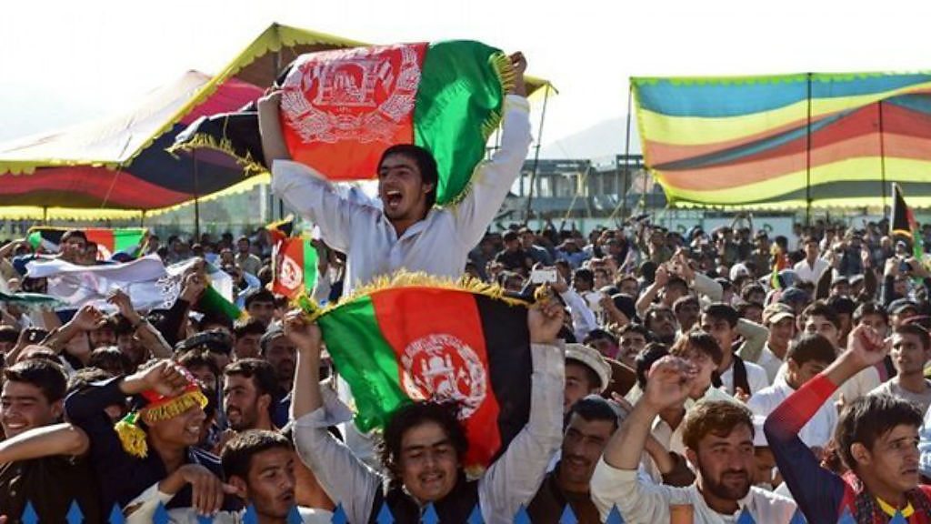 BBC Pashto’s Sana Safi grew up during the Taliban rule and only became aware of cricket when the national team started to hit the news in 2007. She is now on a mission to learn the language of cricket and has even put on pads and helmet for a coaching session at Lord’s in London, the home of cricket: (Picture credit: AFP, Afghanistan fans)