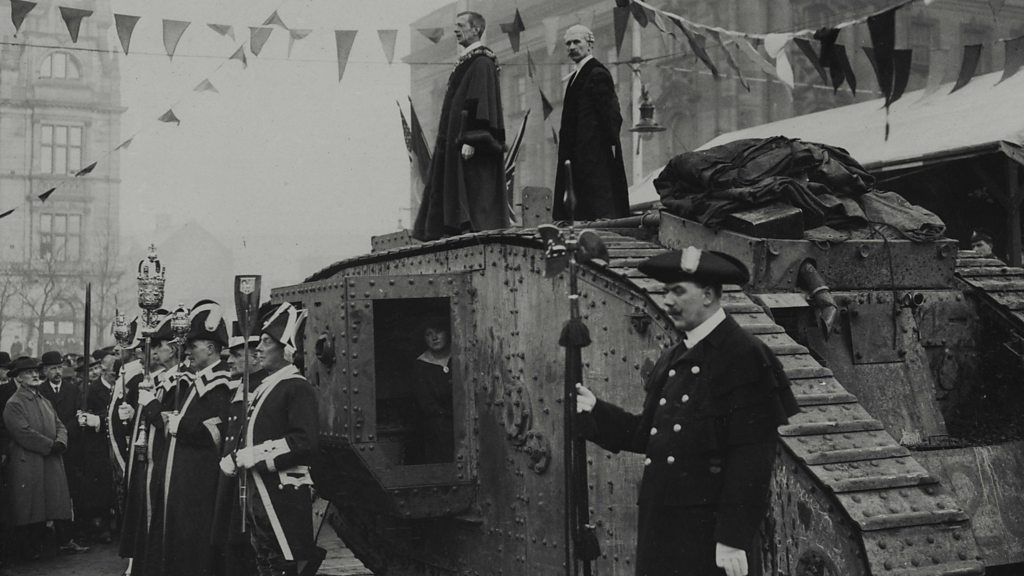 The wartime Mayor of Preston, Harry Cartmell thought the so-called "tank banks" were an act of genius. They had been set up to raise money for the war effort by capitalising on the national craze for the new super-weapon, which it had been hoped would decisively swing the course of the war in favour of the allies. The idea was that towns and cities would have their own "tank week”. In Preston, that week was in January 1918. In that time, a genuine tank - from the front line - would be the focus for the fund-raising effort. All the tanks had names. In Preston they had "Egbert”. Two women sat inside the tanks and took in money from businesses and individuals in the town, in return for bonds or savings certificates (it was seen as a good investment, with a 5% return.) In his memoirs, Cartmell describes one old man turning up with a fish basket full of copper, three penny pieces, gold and treasury notes. A widow invested all of her lifetime savings. The main investors though were the businesses of the town - principally from the cotton industry. In all, Preston raised over one million pounds. The city or town that raised the most money per capita would win a tank to keep permanently. Although the likes of Preston did well, the eventual winner was West Hartlepool in the North East. After the war many places were given old tanks to display. Preston's was in Avenham Park Location: Preston, Lancashire Image: Harry Cartmell on a tank in Preston, courtesy of Harris Museum and Art Gallery