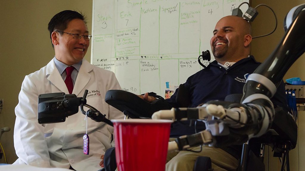 Using thoughts to control robotic limbs via brain implants is something scientists have been developing for years. But up until now the robotic movements have tended to be clunky, or jerky, as the user had to think through the movements need to complete a task step by step. Now, scientists have developed a way of controlling the robotic arm through the power of intention alone. A patient with paralysis has been able to shake hands, drink, and even play rock-paper-scissors using this new method. Richard Andersen from the California Institute of Technology explains this new development. Biomimicry: The Latest Designs Inspired by Nature Nature has been working on the solutions to some of engineering’s biggest problems for billions of years. So, rather than reinvent the wheel, scientists are taking a shortcut by studying the ways that animals have already solved human problems. We head to London’s Natural History Museum where scientists are uncovering the secrets of an immense collection of insect specimens and have discovered a biological way to improve the efficiency of solar panels. Presenter Jack Stewart also speaks to scientist Dr Sridhar Kota about how nature inspired his design for a Nasa plane with flexible wings. We may only have scratched the surface of the potential that biomimicry holds. Antarctic Ice Melt Glacier scientists Jonathan Bamber and Bert Wouters warn us that ice loss is suddenly occurring at an unprecedented rate in a previously stable area of the Antarctic. Jack speaks with BBC Science correspondent Jonathan Amos about what this latest research could mean. Plus, we look at other science news in the last week. Presenter: Jack Stewart Producer: Melanie Brown (Photo: Dr Charles Y. Liu, professor of neurological surgery, neurology, and biomedical engineering at USC, shares a laugh with patient Erik Sorto. Credit: Lance Hayashida, Caltech)