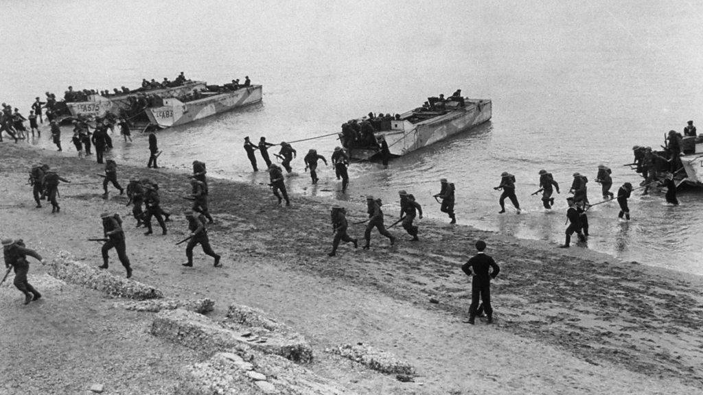 BBC news reports live from the Normandy Invasion. You'll hear Colin Wills with British troops as they embark for Normandy, Guy Byam reporting as he parachutes into France with British airborne forces, and US President Eisenhower telling the people of western Europe, "The hour of your liberation is approaching". (Photo: Troops coming ashore during training exercises for the Allied D-Day invasion.) (Credit: Keystone/Getty Images)