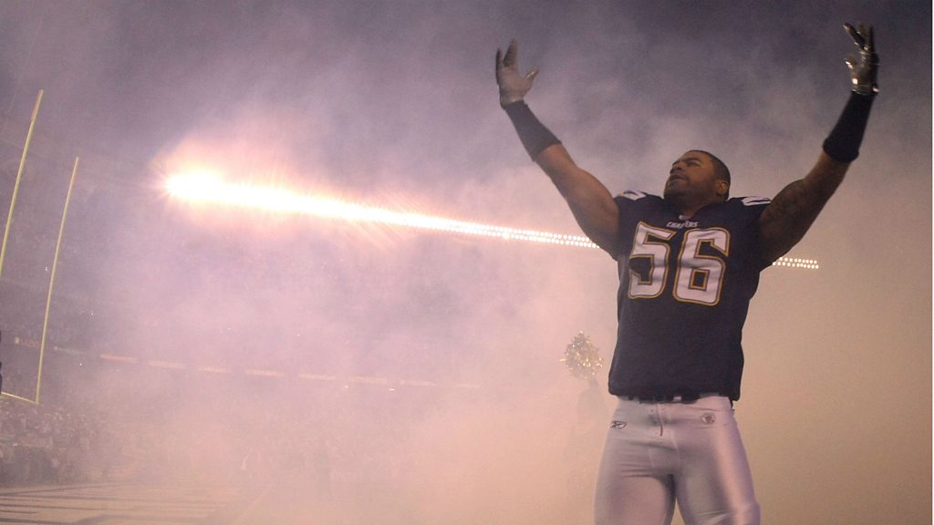 Shawne Merriman, the former American footballer famous for his "Lights Out" celebration dance, and who was banned for doping.. talks to Caroline barker about the new NFL season, and why he not all bad! Photo: Shawne Merriman #56 of the San Diego Chargers enters the game in 2007 during his playing days (CREDIT: Donald Miralle/Getty Images)
