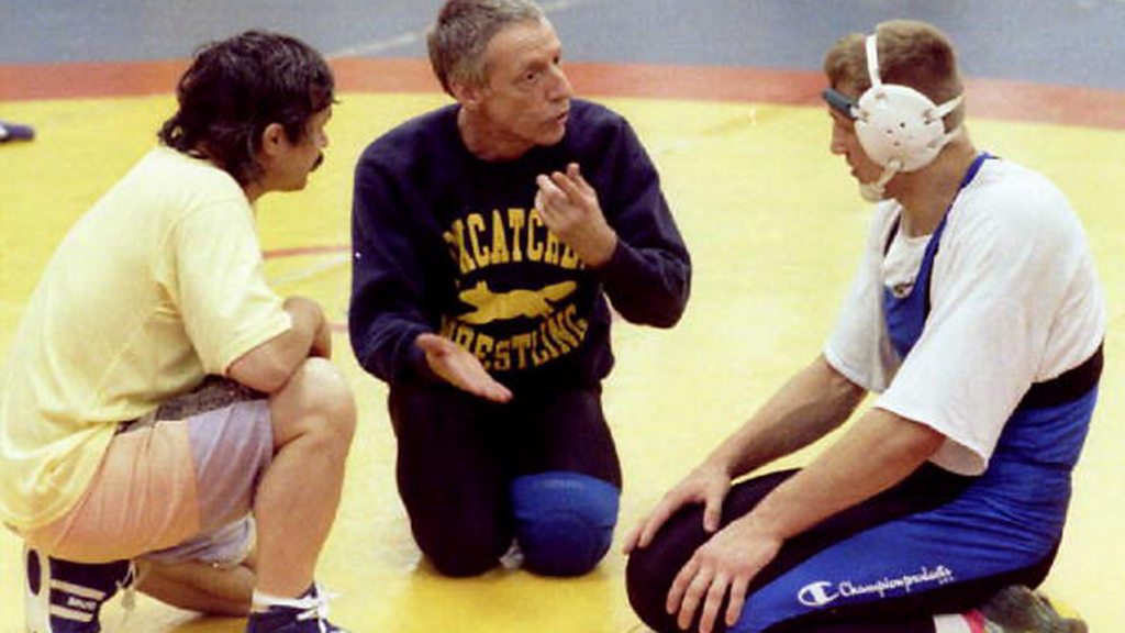 In 1996 an American multi-millionaire murdered one of the wrestlers he was sponsoring. The murder victim, Dave Schultz ,was an Olympic champion. The killer, John du Pont, was the heir to the Du Pont chemicals fortune and had spent millions supporting athletes and allowing them to train on the facilities he had built on his farm, Foxcatcher. Dave Schultz's brother Mark talks to Witness. (Photo: John du Pont (centre) talking to two wrestlers at the Foxcatcher farm, 1992. Credit: Tom Mihalek/Getty Images)