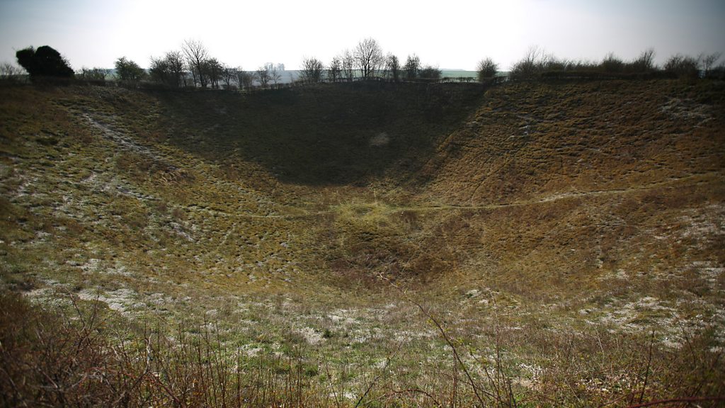 Archive recordings of the tunnellers who fought underground in WW1. They would dig tunnels under no-mans-land to detonate explosives under enemy positions. It was extremely dangerous work. During the war, all sides carried out military mining against enemy positions. The explosions were so large they could kill thousands of soldiers in an instant, and would scar the battlefield with huge craters. Photo: The La Boiselle crater was made when a huge mine was detonated on the first day of the Somme offensive during WW1 in July 1916. (Peter Macdiarmid/Getty Images)