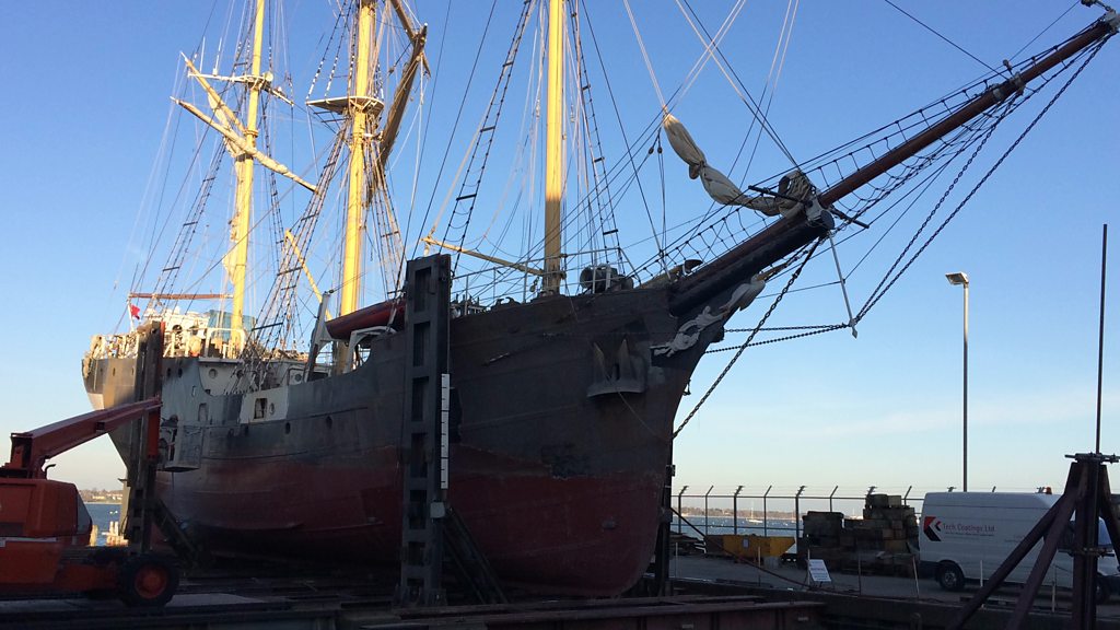 TS Pelican is based in Weymouth. When she's home, she berths in the entrance to the harbour and is an imposing sight on the water front. Owned and operated by Weymouth based Adventure Under Sail, she regularly tours Europe and beyond, and is one of just a handful of sail training vessels. Every few years she has to be taken out of the water for safety checks and refurbishment. But getting a tall ship out of the water takes some logistical planning, as BBC Radio Solent's reporter Neil Sackley found out when he went to visit her and her team of travelling volunteers in Southampton. CEO of Adventure Under Sail Rikk Butler explained how she ended up ON the dockside.