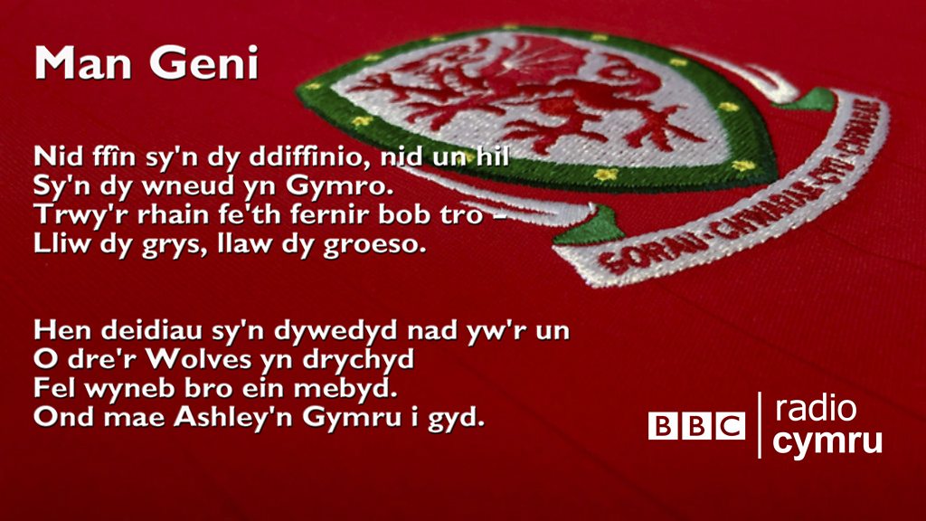 i Ashley Williams a'i griw. Nid ffîn sy'n dy ddiffinio, nid un hil Sy'n dy wneud yn Gymro. Trwy'r rhain fe'th fernir bob tro – Lliw dy grys, llaw dy groeso. Hen deidiau sy'n dywedyd nad yw'r un O dre'r Wolves yn drychyd Fel wyneb bro ein mebyd. Ond mae Ashley'n Gymru i gyd.