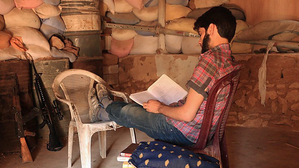 Away from the sound of bombs and bullets, in the basement of a crumbling house in the besieged Syrian town of Darayya, is a secret library. It is home to thousands of books rescued from bombed-out buildings by local volunteers, who daily brave snipers and shells to fill its shelves. In a town gripped by hunger and death after three years without food aid, Mike Thomson reveals how this literary sanctuary is proving a lifeline to a community shattered by war. *Omar, the FSA soldier pictured above who was the last voice heard in this programme has been killed in fighting.* (Photo: Omar Abu Anas, a Free Syrian Army soldier reads on the front line)