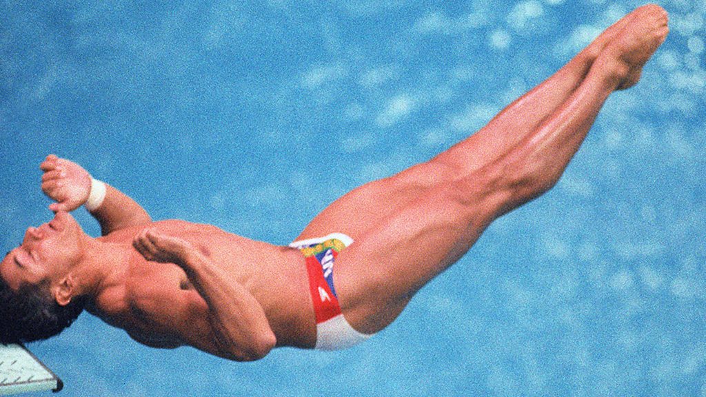 America's greatest diver on hitting his head on the diving board at Seoul Olympics 1988. 'I was totally embarrassed. This was the Olympics, you're meant to be pretty good.' Picture: Greg Louganis of the US bangs his head against the board after mistiming his dive during the Olympic competition. Credit: AFP/Getty Images