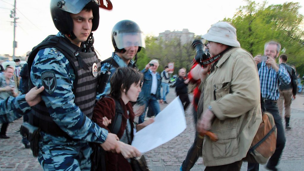 Police arrest a protester in Moscow’s Bolotnaya Square earlier this year (A protester is carried away by police)