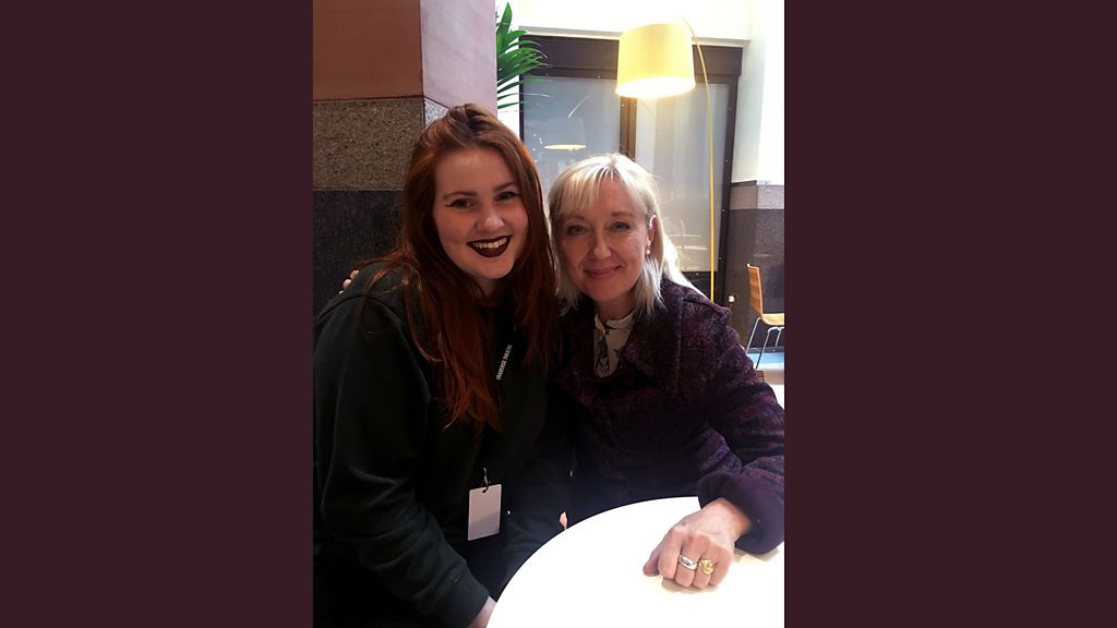 Tha Alannah Pheutan ag innse do Chathy mun obair a th' aicese aig Fèis Dhùn Èideann