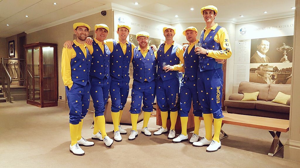 The likes of Rory McIlroy, Danny Willett and the rest of Team Europe will have added support during the Ryder Cup this weekend from a certain section of the crowd A group of fans who call themselves the 'Ryder Cup Guardians' have created a song for every single Team Europe golfer - even managing to come up with a song for Spaniard Rafael Cabrera-Bello. Alistair Bruce-Ball is given a taster of their repertoire for this year's competition. Full coverage of the Ryder Cup begins at 13:00 BST on Friday on BBC Radio 5 live. This clip is from 5 live Sport on Thursday 29 September 2016.