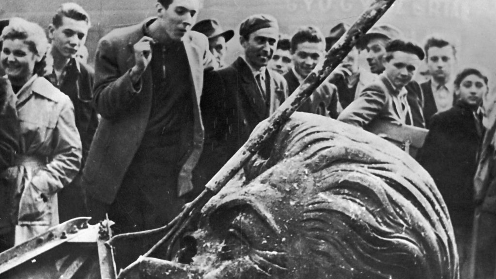 In October 1956 students and workers took to the streets of Budapest to protest at Soviet rule in Hungary. The demonstrations turned violent and for a while the revolutionaries were in control before being brutally repressed. Ed Butler spoke in 2010 to one of the rebels, Peter Pallai. (Photo: November 10, 1956 - A crowd of people surround the demolished head of a statue of Josef Stalin, including Daniel Sego, the man who cut off the head, during the Hungarian Revolt, Budapest, Hungary.) (Credit: Keystone/Getty Images)