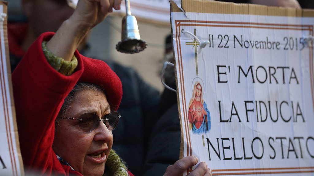 Why are Italy's banks in crisis and what's the impact on business? The country's banks have huge numbers of non-performing loans, the result of nearly a decade of recession. The economy has shrunk by nearly 10% in that time. Some small banks have already failed, others may follow. What has it been like to do business through these very lean times? Are banks continuing to lend? And what solutions might there be for one of Europe's biggest players? Ruth Sunderland visits small businesses, the backbone of the Italian economy, and asks what is required to strengthen the banking system. Producer : Rosamund Jones. (Image: Woman at a protest against the collapse of four Italian banks in central Rome on December 22, 2015. Credit: TIZIANA FABI/AFP/Getty Images)