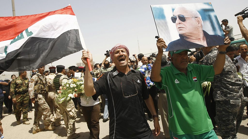 In 2009, thousands of Iraqis gathered at the National Football Stadium to attend the funeral of the player and coach, Emmanuel Baba Dawud, better known as Ammo Baba. Ammo Baba was a beloved player, whose heading ability was legendary and who scored Iraq's first ever international goal. As a coach, Ammo Baba won many regional trophies for the Iraqi team and stood up to Saddam Hussein's sadistic son, Uday. His brother, Banwal Baba Dawud, talks to Ashley Byrne. The programme is a Made-In-Manchester Production. PHOTO: Mourners at Ammo Baba's funeral (Getty Images)