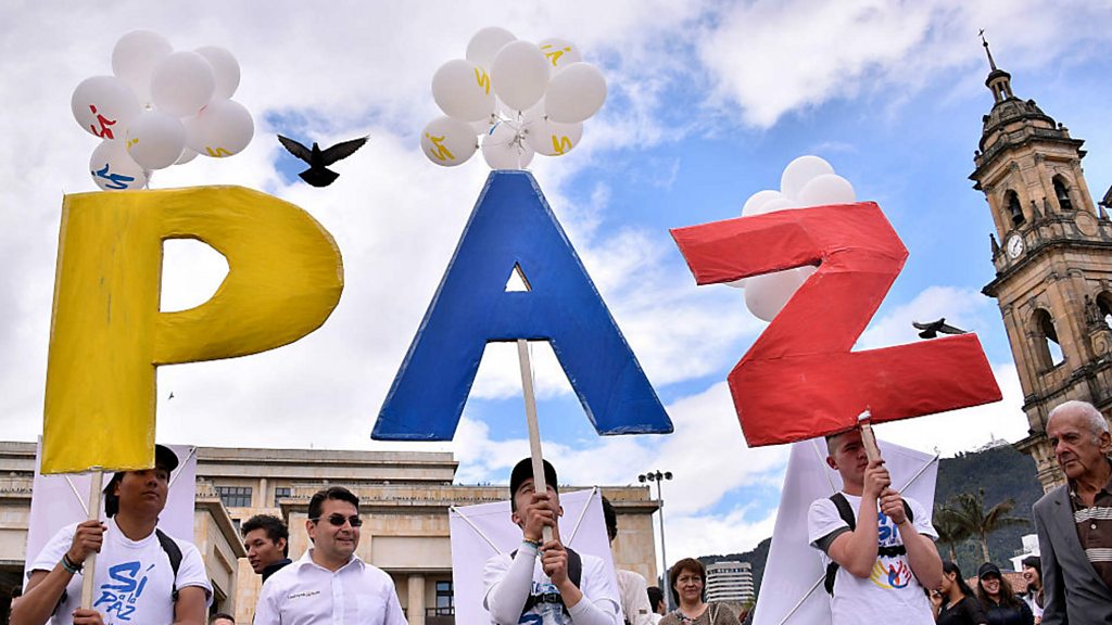Members of the audience at the World Questions debate in Bogota, Colombia give their views on whether President Juan Manuel Santos should have won this year's Nobel Peace Prize. Photo Image: People at Bogota's Bolivar main square celebrating the peace agreement between the Colombian government and the Revolutionary Armed Forces of Colombia (FARC) Picture Credit: GUILLERMO LEGARIA/AFP/Getty Images