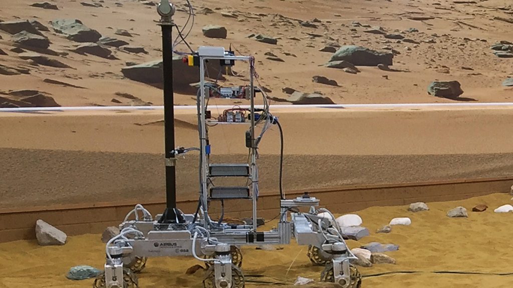 Prototype Mars Rover, Brian, driving round his almost Martian home in the UK’s Mars Yard. Presenter Marnie Chesterton finds out from spacecraft structures engineer Abbie Hutty. Photo: The Mars Rover Credit: BBC