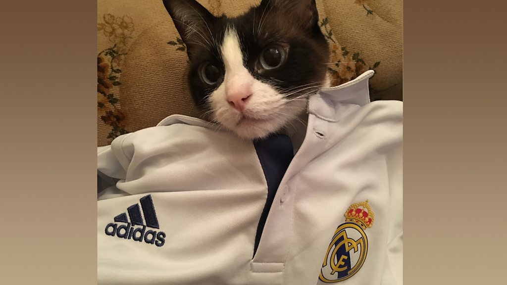 Meet one of Real Madrid's 92,000 fan-owners, known as "socios" - and her cat, Nana. (Image: Nana the cat in a Real Madrid shirt. Credit: Pilar Rodriguez)