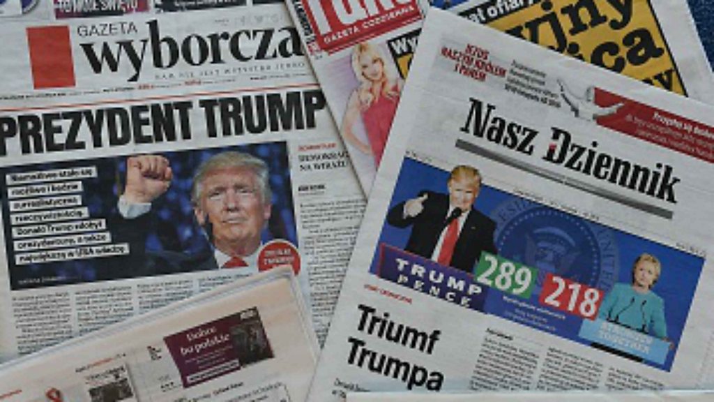 Polish politicians Dominik Tarczyński from the governing Law and Justice Party and Rafal Trzaskowski from Civic Platform discuss what the election of Donald Trump will mean for Poland. This was recorded during a World Questions debate in Warsaw, Poland. (Photo Image: Polish newspapers the day after the victory of Donald Trump Photo credit: JANEK SKARZYNSKI/AFP/Getty Images)
