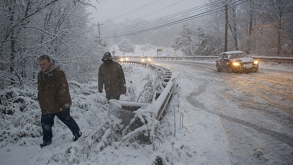 Sam Schneski recorded this as he ferried a tank of maple sap on the back of a truck. (Picture: Two men (not contributor) walk down an icy road in Vermont, 29/102011 Credit: DON EMMERT/AFP/Getty Images)