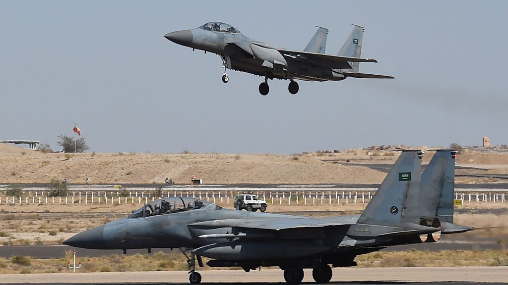 Former diplomat, Nabeel Khoury says without the support of the US and the UK, Saudi Arabia would be hard-pressed to continue their military campaign in Yemen. (Photo: Saudi F-15 fighter jet landing at a military airbase, some 880 km from the capital Riyadh, as the Saudi army conducts operations over Yemen. Credit: Getty Images)