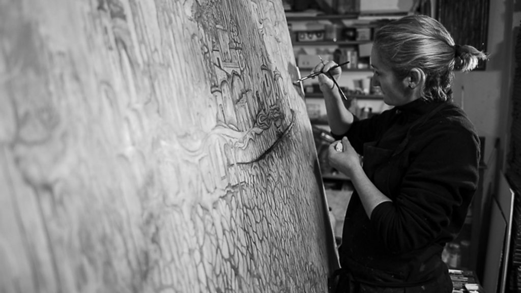 Can you draw and count at the same time? It might reveal whether you’re thinking in words or pictures (Image: Romanie painting in her studio. Credit: Romanie Sanchez / Rafa Rabassa)