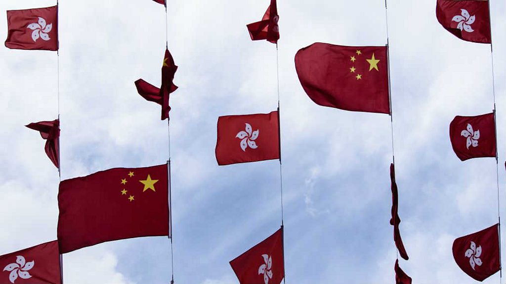 Ronald Arculli, former Convenor of the Executive Council, Emily Lau, the first woman elected to Hong Kong's Legislative Council and Joshua Wong pro-democracy activist and Secretary General of Demosistō discuss whether full universal suffrage will come to Hong Kong. (Photo: Flags of China (red and yellow) and Hong Kong are displayed between two buildings in Hong Kong (Photo credit: ANTHONY WALLACE/AFP/Getty Images)
