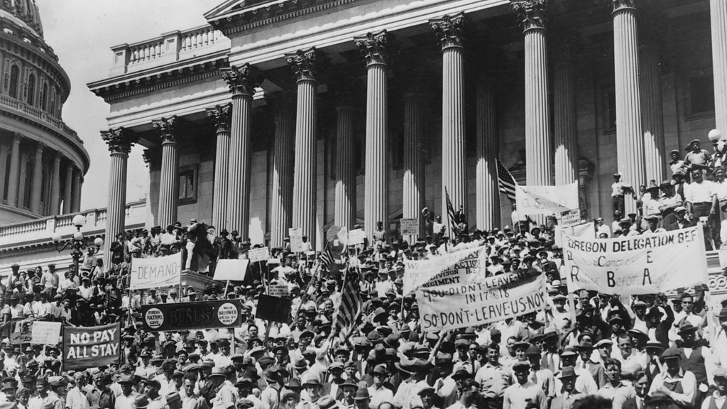 In the summer of 1932, tens of thousands of American First World War veterans marched on Washington DC to demand the bonus they'd been promised by the government for their part in the war. It was the height of the Great Depression and many were unemployed and hungry. They called themselves the Bonus Army. Louise Hidalgo talks to author Paul Dickson about their story. Photograph: Bonus Army marchers stage a mass vigil on the steps of the Capitol building in Washington while the Senate debates their case (Copyright: Getty Archive)