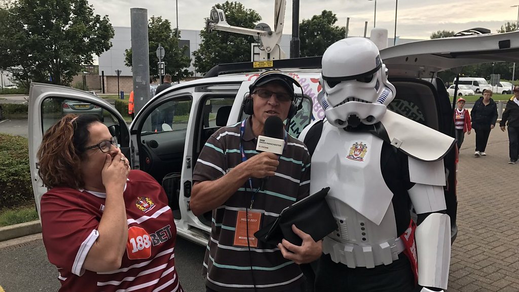 Jack Dearden talks to a Star Wars stormtrooper who supports Wigan Warriors.