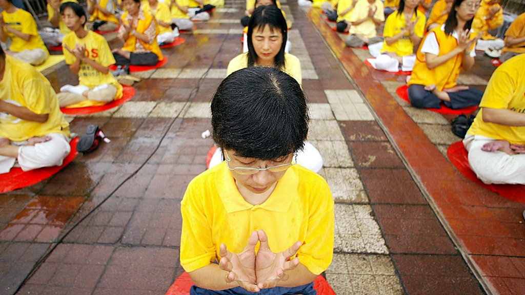 In July 1999, the spiritual movement Falun Gong was banned in China. Thousands of people were arrested. The Chinese government says Falun Gong is an "evil cult", but followers of the movement say they have been the victims of state persecution. Witness speaks to Falun Gong practitioner Chao Yu and journalist Ian Johnson. (Photo: Falun Gong practitioners stage a sit-in protest outside the Convention and Exhibition Centre in Hong Kong, 2002. Credit: Peter Parks/AFP/Getty Images)