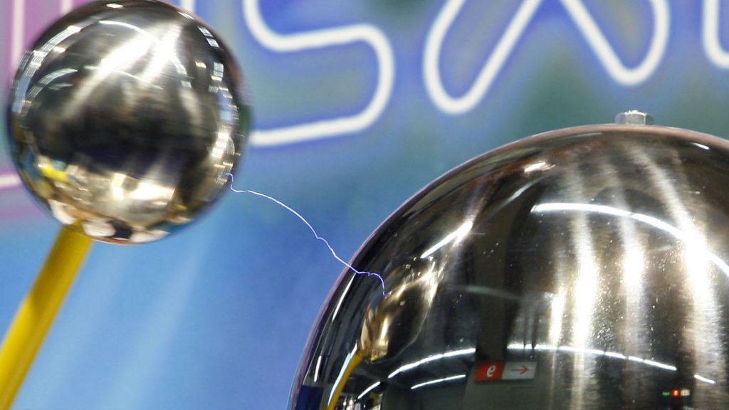 Rhys Phillips, engineer at Airbus Group Innovations, shows presenter Marnie Chesterton how to make tiny bolts of lightning with a Van de Graaff generator. (Image: Lightning being produced with a 'Van de Graaff generator'. Credit: Getty Images)