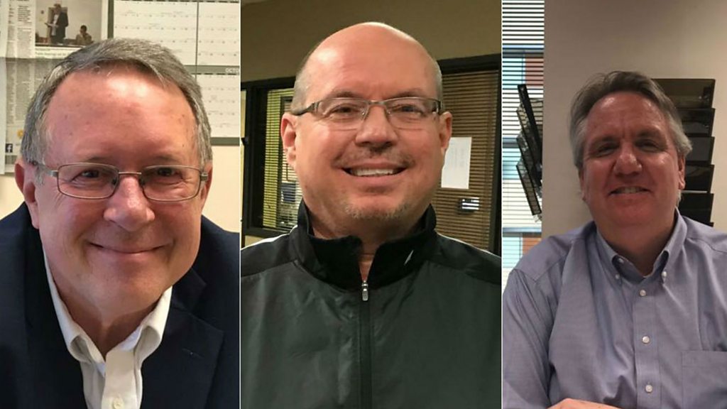 Gary Abernathy Publisher and Editor of the Times-Gazette in Hillsboro, Ohio. Scott Brooks Publisher at the Waxahachie Daily Light in Texas: Both these two papers backed President Trump during the presidential campaign. Phil Boas Editorial Director of The Arizona Republic in Phoenix has always supported the Republican candidate but felt they had to change allegiance because of Donald Trump. One year on do they have any regrets with their decisions? (Photo Gary Abernathy, Scott Brooks, Phil Boas. Credit: BBC)