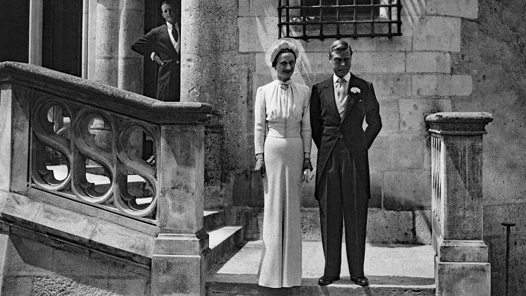 Edward VIII of England, eldest son of George V and Mary of Teck, abdicated because of his love affair with American-born divorcee Wallis Simpson. After his abdication, he became Duke of Windsor and married Mrs. Simpson, who had changed her name by deed poll to Wallis Warfield, in a private ceremony on 3 June 1937. Only 16 people attended the wedding. Julie Pellegrin, a former curator of Chateau de Candé, explains how Wallis Simpson married in pale blue - a colour that became famous because she wore it so frequently - and a 'strange hat with feathers'. Photo: Edward, Duke of Windsor, and formerly Edward VIII of England, and his wife Wallis Simpson, are seen, 03 June 1937, during their wedding, at Chateau de Candé, Monts, France. Credit: OFF/AFP/Getty Images