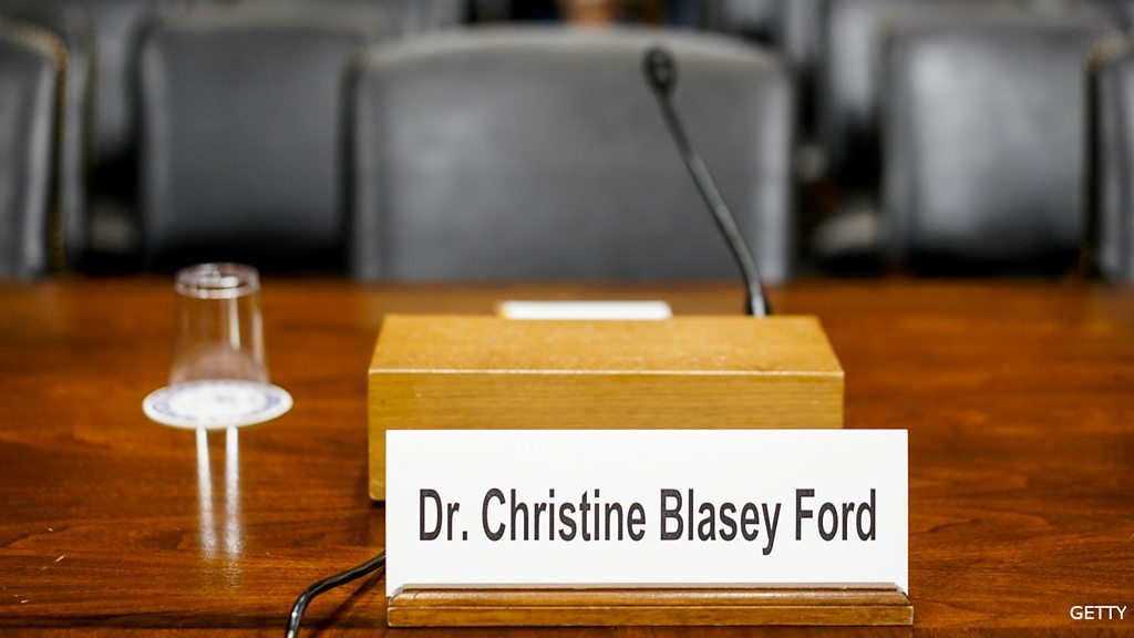 US Supreme Court nominee Brett Kavanaugh is facing allegations of sexual misconduct from a woman called Christine Blasey Ford. Her lawyers say she's been receiving death threats and harassment since coming forward. (Photo: Christine Blasey Ford's desk for her hearing. She is testifying against Supreme Court nominee Judge Brett Kavanaugh for sexually assaulting her in 1982. Credit: Melina Mara-Pool/Getty Images)