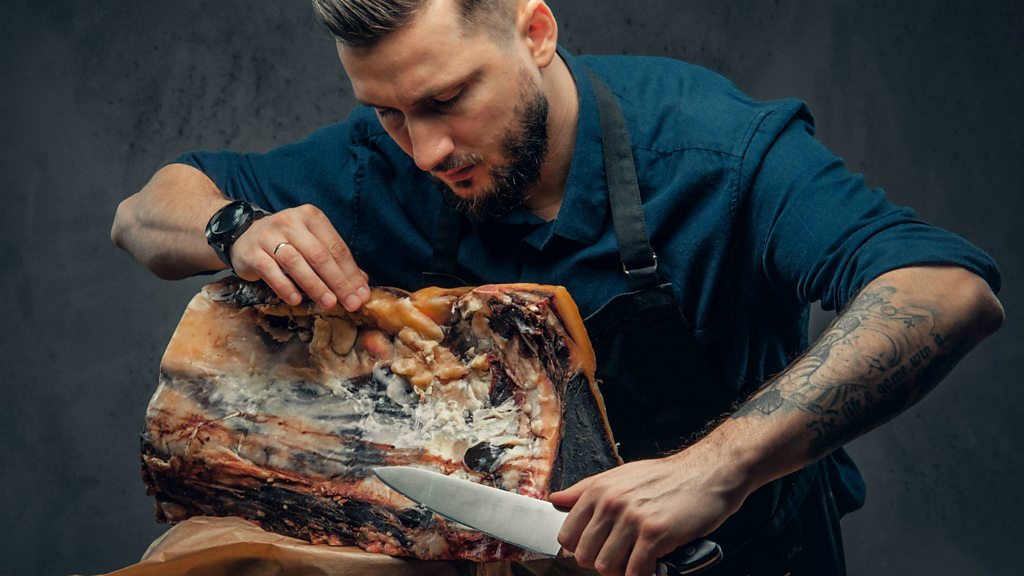 Brent Young is co-founder of The Meat Hook butcher's shop in Brooklyn, New York. He tells Emily Thomas why so many young people - often with high-flying well paid jobs - are drawn to butchery with its long hours and physical, bloody work. They are joined by Isioma Emina from Reds and Greens in Lagos. (Image: Trendy butcher slicing meat Image Credit: Getty Images)