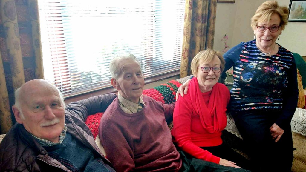 John Toal meets author Walter Simons in Dundrum, with the three McClean siblings he rescued over 50 years ago from the sea in Newcastle - Michael, Rosaleen and Theresa.