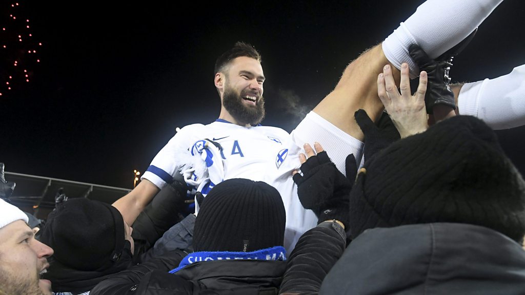After 112 years, Finland's men finally qualify for a major tournament. We hear from captain Tim Sparv on the team's cultural diversity, goalkeeper Lukas Hradecky on his post-playing plans of running a pub, and former keeper Antti Niemi, who's enjoying the feeling of being stopped in the street as football takes the sporting limelight from ice hockey. Photo credit: Finnish captain Tim Sparv celebrates with fans after qualifying for UEFA Euro 2020. (AFP/ Finland OUT)