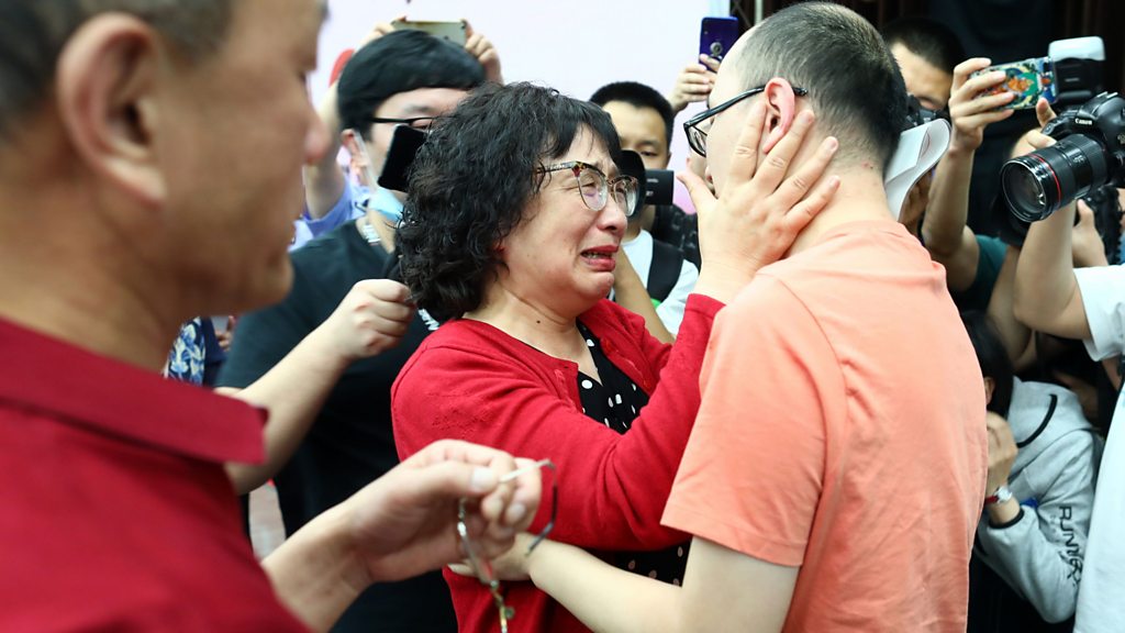 In 1988 Li Jingzhi’s 2-year-old son was abducted from a hotel lobby in China and disappeared without a trace. She never stopped looking for him, appearing on numerous Chinese television shows and distributing more than 100,000 flyers. Through her many years of searching she was able to help reunite many other parents with their missing children. Then this year, after 32 years she was finally reunited with her son. Presenter: Emily Webb Producer: Deiniol Buxton Picture: Mao Yin reuniting with his mother Li Jingzhi Credit: Getty Images