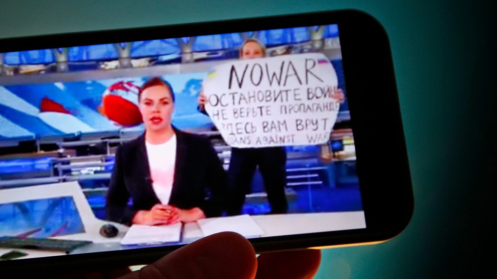 A journalist holding an anti-war sign ran on to the set of a Russian evening news programme on the state-controlled Channel 1 on Monday evening. The sign, clearly visible behind the presenter, read: "No war, stop the war, don't believe the propaganda, they are lying to you here." The woman has been named as Marina Ovsyannikova, an editor at the channel. Russian TV news is tightly controlled by the Kremlin and reflects only the Russian version of events in Ukraine. Russian television news has long been controlled by the Kremlin and independent viewpoints are rare on all the major channels. Ms Ovsyannikova whereabouts are now unknown. Arkady Ostrovsky, the Russia Editor for The Economist, says this reminds him of the bravery of Russian journalists during the coup of 1991. He says that the channel site where Monday night's protest happened is one of the most guarded, and that this "extraordinarily brave protest shows Russian media control is not complete," and that he thinks this is a sign that a "sense of resistance is building". Photo: A video of the protest on Russia's Channel 1, as seen on a mobile Credit: Getty Images