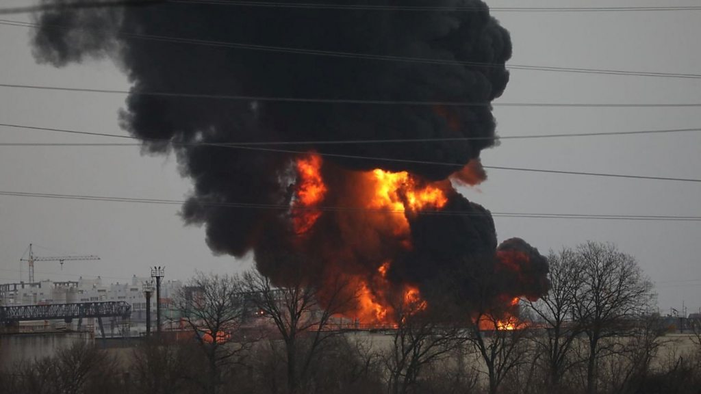 An oil storage depot was set on fire in Belgorod, a Russian city just north of Ukraine, earlier this week, after what Russia described as an attack by two Ukrainian helicopters. Videos shared on social media showed a fire in Belgorod, 40km (25 miles) from the border and also grainy security camera footage of what appears to be two helicopters firing rockets, allegedly at the depot. Ukraine's top security official, however, denied Ukrainian forces were behind the attack. Ukrainian aircraft have not struck targets in Russia previously in the war. Jenny Hill, the BBC correspondent in Moscow, weighs up the fallout from the attack. She says the Russian response has been "muted", which she finds unusual, given how Russia has framed Ukraine as the aggressor in the past. She also speculates that, if Ukraine were behind the attack, Russia may be embarrassed by such an attack having claimed air-superiority in the region. She goes on to say that a wish for the peace talks to succeed may mean both sides are reluctant to amplify the situation, but in terms of responsibility for the attack, the evidence and rhetoric is inconclusive. "Is it possible that both sides think, 'let's not make too much out of this' as it will raise tensions at a time when our delegations are trying to reduce tensions?" Photo: A fuel depot on fire in the city of Belgorod, Russia April 1, 2022 Credit: Reuters
