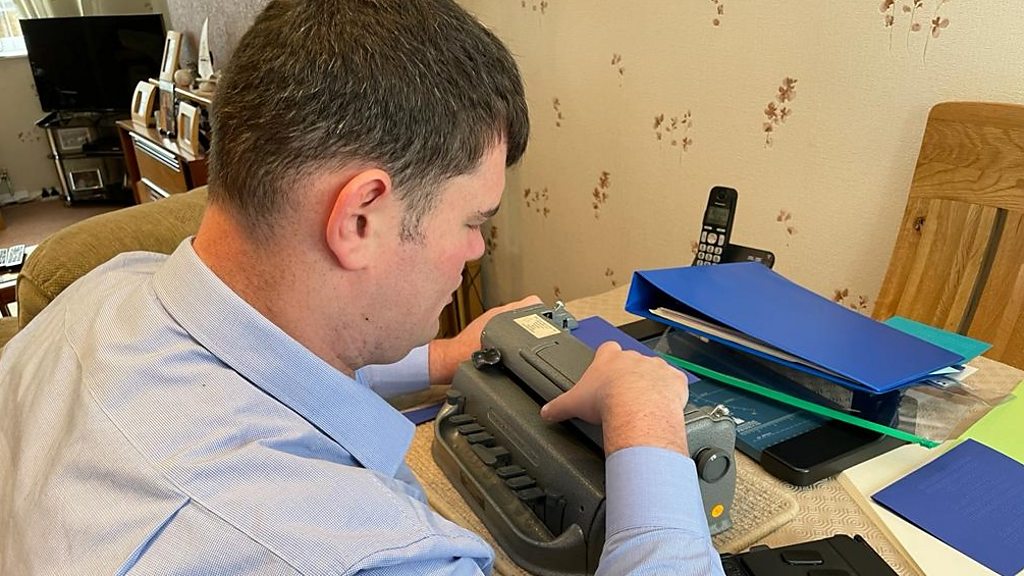 Brandon Hulcoop has been blind since birth but feels creatures like rabbits and dogs then draws them using a braille typewriter