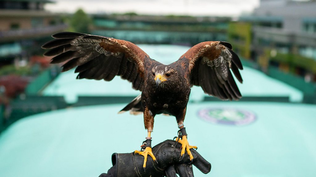 While the biggest stars in tennis are on the court at Wimbledon, Rufus, an American Harris hawk, is there every day to keep an eye out for pigeons. His job is to patrol the skies, scare away pigeons and stop them eating the grass. Jamie Broughton met up recently with Rufus while on patrol with his handler, Donna Davis. (Image: Rufus the hawk at Wimbledon, Credit: PA)