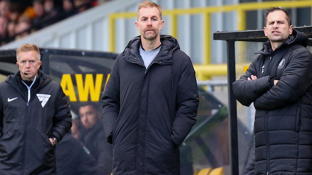 Harrogate Town manager Simon Weaver speaking to Tim Steere, after their 3-2 loss away at Fleetwood Town.