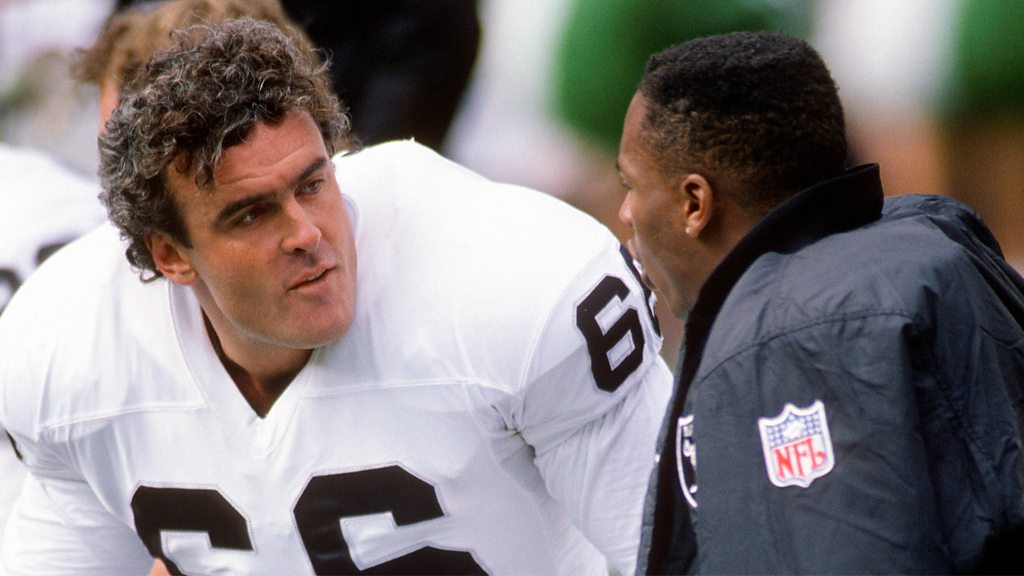 How do we as individuals balance the challenges thrown at us in life and not engage in damaging behaviour. for Steve Wright there as an added layer of difficulty. His job as an NFL player required him to act in, and occupy an aggressive state of mind. But flicking a switch to go from mild mannered to threatening and destructive and back again wasn't easy. Alongside his wife and author Lizzy Wright, Steve explores the subject in their book "Aggressively Human: Discovering Humanity in the NFL, Reality TV, and Life." PHOTO: PHILADELPHIA, PA - OCTOBER 22: Steve Wright #66 of the Los Angeles Raiders talks with teammate Bo Jackson during an NFL football game against the Philadelphia Eagles October 22, 1989 at Veterans Stadium in Philadelphia, Pennsylvania. Wright played for the Raiders from 1987-93. (CREDIT: Focus on Sport/Getty Images)