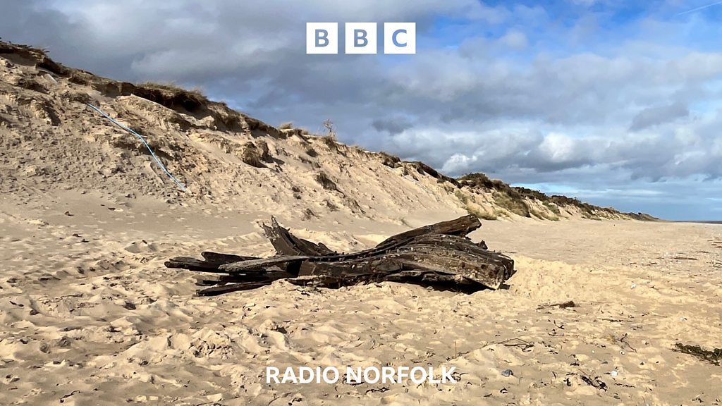 A mysterious wreck has appeared on Hemsby beach. Initial suggestions think it could date back hundreds of years. Photo credit: Shaun Whitmore / BBC