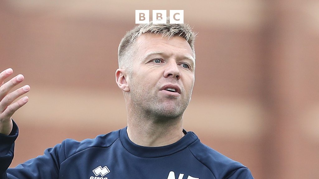 The Hartlepool United manager Nicky Featherstone speaks to Rob Law after the 7-0 thrashing at Wealdstone in the National League. Image: Getty