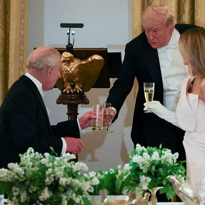 At a White House state dinner King Charles has hailed the importance of alliances between the United Kingdom and the United States in a "contested world". In his toast President Trump called the ties with the UK a "friendship ulike any other" and said the King agrees with him that Iran must not have a nuclear weapon. The former FBI director James Comey has been charged over a social media post which the Trump administration asserts threatened the president's life. It marks the second attempt to indict James Comey within the space of a year. And we look at why the United Arab Emirates exiting OPEC, the organisation of Petroleum Exporting Countries, is a big deal. Presenters: James Copnall and Anne Soy. (Photo: Britain's King Charles, US President Donald Trump and first lady Melania Trump raise their drinks during a state dinner for the King and Queen Camilla. Credit: Suzanne Plunkett/Reuters).