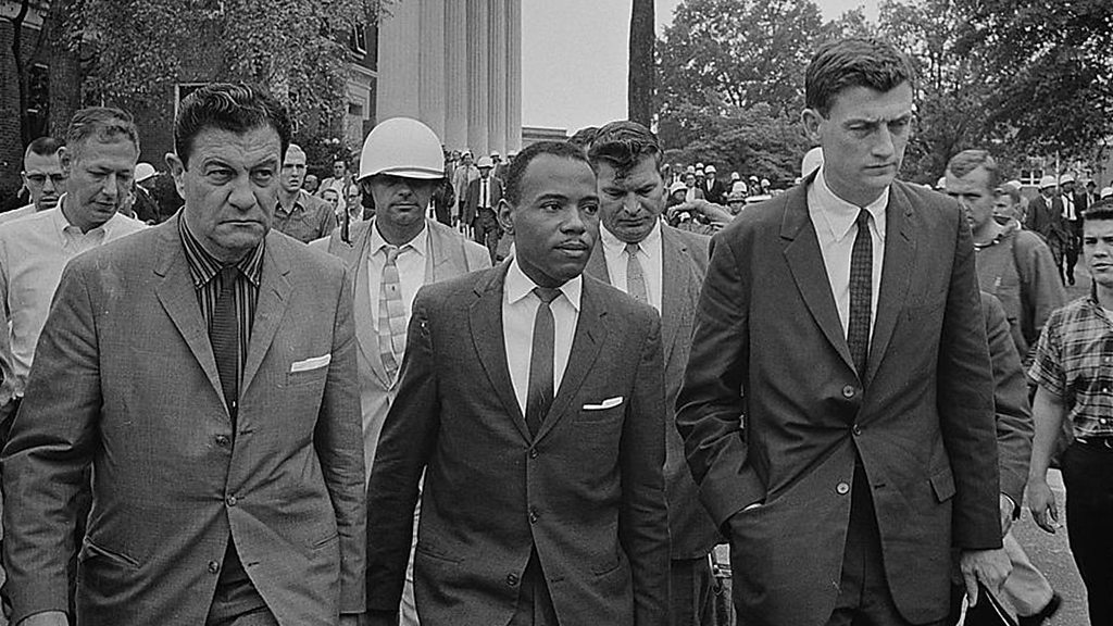 There were riots when the first black student was enrolled at the University of Mississippi in the American south in October 1962. Mississippi's white segregationist governor only allowed James Meredith to be admitted after President John F Kennedy himself intervened. Louise Hidalgo has been talking to Norma Watkins, the daughter of the governor's lawyer, about that watershed moment and about growing up in one of America's most segregated states. Picture: James Meredith walks to class at Ole Miss university accompanied by US marshals, October 1st 1962 (Credit: Marion S Trikosko courtesy of Library of Congress Prints and Photographs Division, Washington)