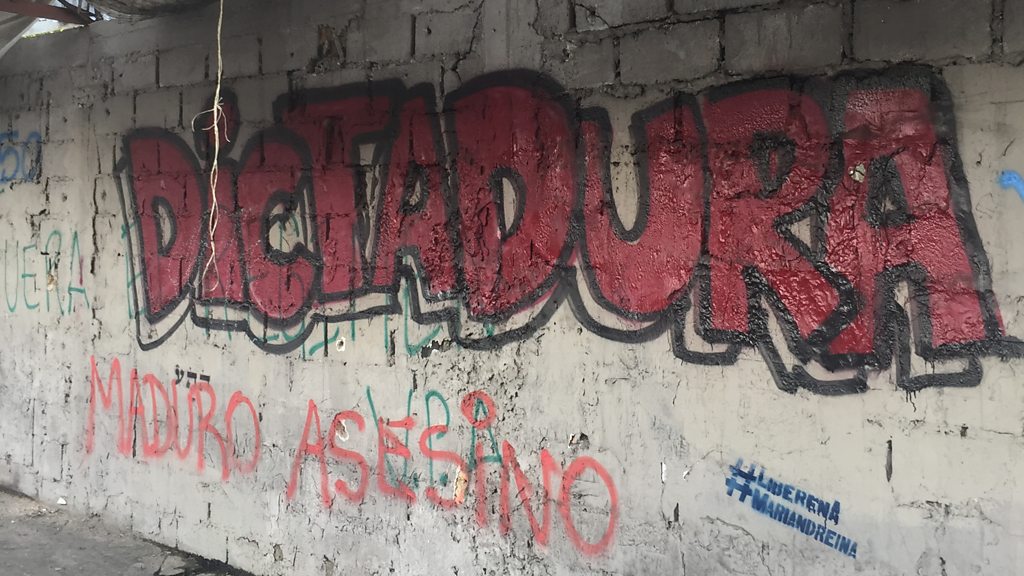 Venezuela has some of the largest oil reserves in the world but incredibly, around four in five Venezuelans live in poverty. The BBC's South America correspondent, Katy Watson, went to cover the unfolding political and economic crisis in Venezuela and found a country divided. (Photo: Anti-government graffiit. Credit: Katy Watson/BBC)