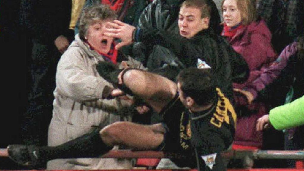 In January 1995, the French forward Eric Cantona shocked football by attacking an opposition fan during a match between Manchester United and Crystal Palace. Cantona faced a court case and was banned for nine months. Simon Watts tells the story of his Kung-Fu kick through BBC interviews with people who were there. PHOTO: The Cantona Kung-Fu kick (AFP/Getty Images)