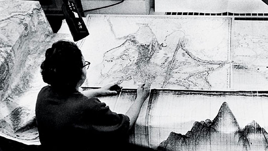The publication of a map of the floor of the Atlantic ocean in 1957 by an American female cartographer, Marie Tharp, helped to change forever the way we view our world. Her discovery of the Mid-Atlantic Ridge was eventually taken as evidence of the theory of plate tectonics. Yet her work was initially dismissed as 'girls' talk', her colleague geologist Bill Ryan tells Louise Hidalgo. Picture: Marie Tharp working on a map of the ocean floor at Columbia University in the 1960s. (Credit: Lamont-Doherty Earth Observatory courtesy of the Marie Tharp estate)
