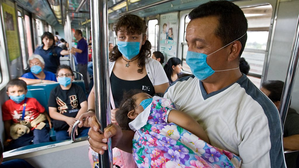 Mexico City, the world's third largest metropolis, was effectively shut down when a new and deadly virus, swine flu appeared. Soon the virus started to spread and was seen as a massive threat to global health. Experts feared millions of people could become infected and many countries began screening airline passengers for symptoms and suspending flights to Mexico. Photo: People wear surgical masks as they ride the subway in Mexico City (Ronaldo Schemidt/AFP/Getty Images)